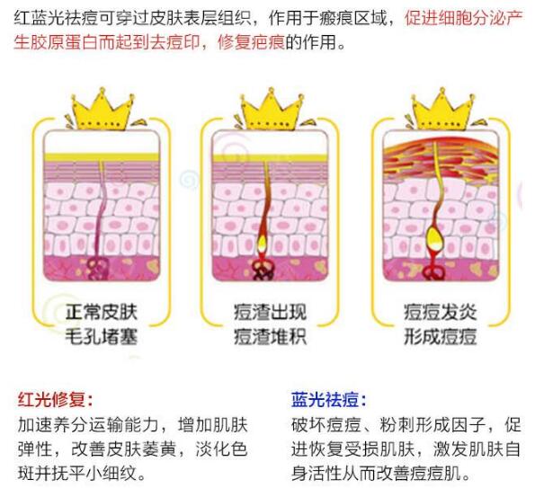 藍光是光波長在405--420nn上下的深藍色光,藍光功于肌膚淺表層,快速消滅痤瘡桿菌,進而具有抑菌消腫的功,還可率高抑止皮腺植物油脂的代謝,避免短時間臉上痘痘的發(fā)作。
