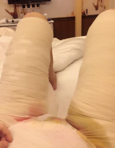 這是手術(shù)當天,第(一)感覺就是,我終于有胸了,哈哈~術(shù)后胸部還好,就只粘了兩個紗布,大腿就捆的像粽子了。