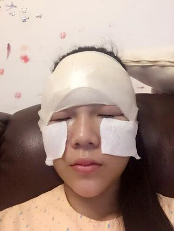 手術(shù)當(dāng)天,氣的特別早,然后就開始準(zhǔn)備手術(shù),我是全麻的,做手術(shù)期間我是什么也不知道,等我醒來的時候,已經(jīng)做好了填充,額頭和臉頰都已經(jīng)用紗布包裹好了!果現(xiàn)在是看不出來的,但是臉頰和額頭有點漲,醫(yī)生說這是正常的,那好吧,現(xiàn)在就等做雙眼皮手術(shù)了!